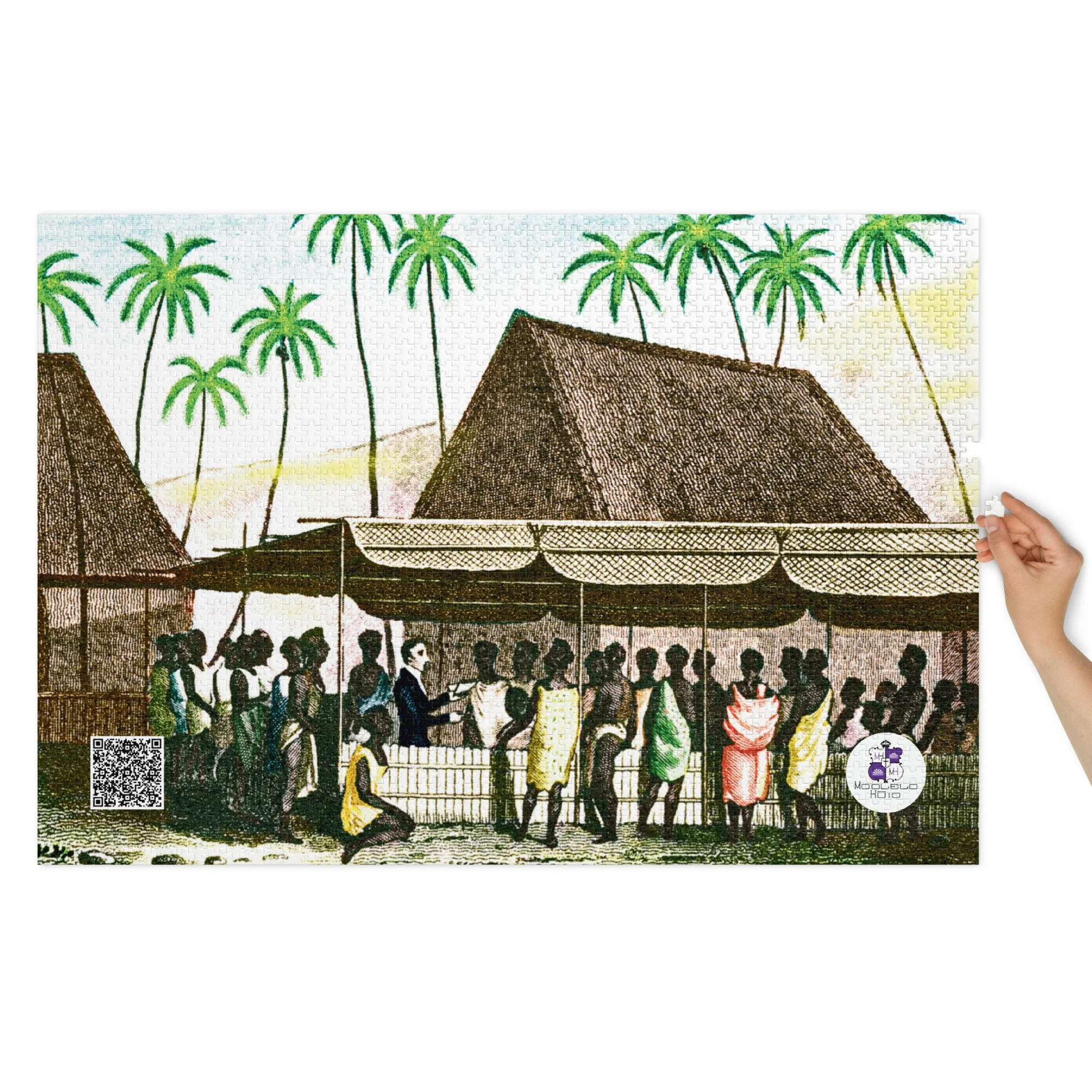 This puzzle features a stylized illustration inspired by early Hawaiian first contact, created in a mid century modern design with traditional petroglyph elements. It is both an art piece and a hands on learning tool. Each puzzle includes a QR code that can be scanned directly from the completed image or from the tin lid. The QR code provides a free digital copy of The Concerts of Prayer, offering students, families, and classrooms additional historical and spiritual context connected to this period in Hawaiian history.